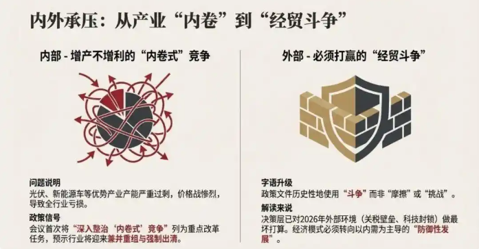 以前我们说“摩擦”,说“挑战”,说“风高浪急”。现在直接摊牌了,就是“斗争”。这说明什么?说明上面已经对2026年的外部环境做了最坏的打算。西方世界的围堵、关税壁垒、科技封锁,在未来五年不会缓解,只会加剧。
